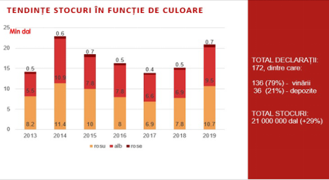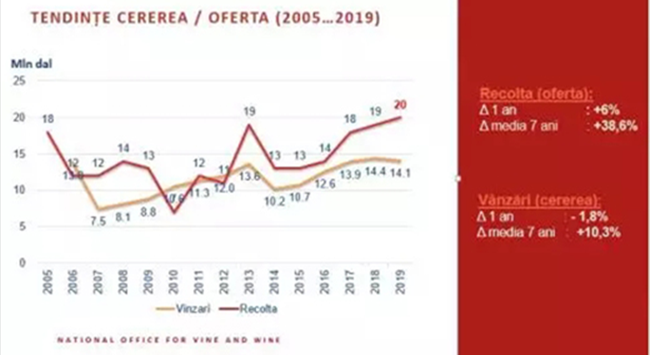 在2018-2019葡萄酒年,基于過去兩年創(chuàng)紀(jì)錄的大收成,葡萄酒供需比基本上達(dá)到了自2013年實施禁運后的數(shù)值。過去7年的平均數(shù)據(jù)顯示,鑒于摩爾多瓦共和國85%的葡萄酒銷往國外,產(chǎn)自摩爾多瓦的葡萄酒是出口市場所能消化的4倍。