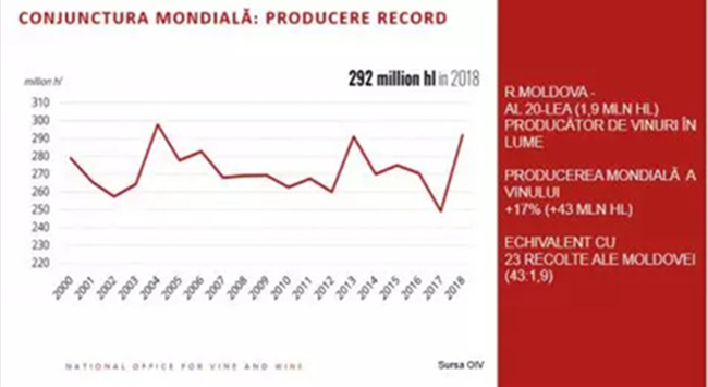 不僅是摩爾多瓦共和國正在經(jīng)歷葡萄酒生產(chǎn)過剩。2018年全球葡萄產(chǎn)量也達(dá)到了創(chuàng)紀(jì)錄的水平(+17%,即430萬千升),增長量相當(dāng)于摩爾多瓦共和國23年的葡萄收獲量。