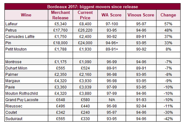 與2016年份一樣,拉弗爾Lafleur的表現最佳,目前價格比發布價漲了57%。一級酒莊的副牌葡萄酒也再次熱賣– 小拉菲Carruades Lafite漲價37%,而小木桐Petit Mouton則漲價8%。