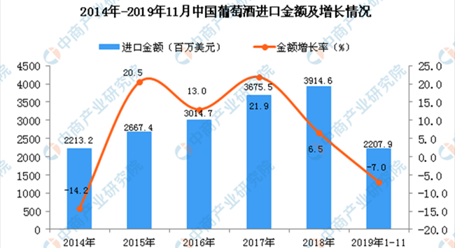 從金額方面來看,2019年1-11月中國葡萄酒進口金額為2207.9百萬美元,同比下降7%。