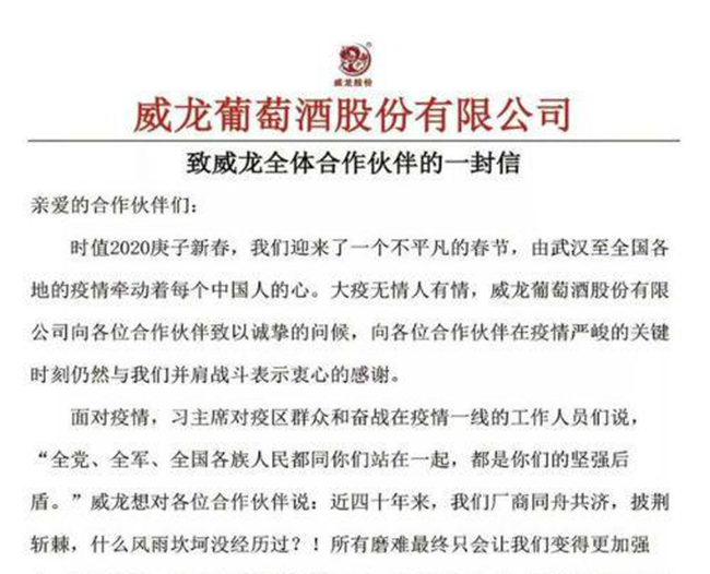 在威龍葡萄酒發(fā)布的公開信中能看到,企業(yè)正試圖通過“攜手并肩,共渡時艱”這樣的積極話語來增強與合作伙伴之間的聯(lián)系。記者從威龍葡萄酒方面進一步了解到,除了在公開信中表達的正面語言,企業(yè)還提出了具體的“渡過時艱”舉措,例如陸續(xù)恢復(fù)物流配送以保障合作伙伴的訂單發(fā)貨需求、強化疫情管控等。