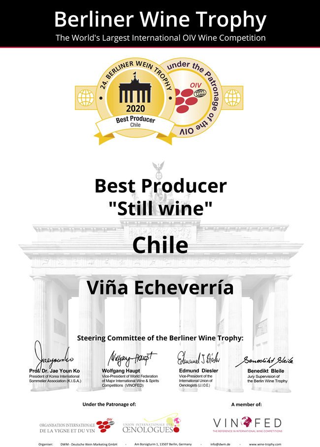 與此同時,智利-安智利雅家族酒莊(Echeverria Family Wines)更是在此項賽事中榮獲了“2020柏林葡萄酒大獎賽-智利最佳生產商”的稱號!其實一切的榮譽都離不開安智利雅家族酒莊自身扎實的發展戰略,自1700年起,安智利雅家族在智利農業領域始終業績出眾,20 世紀初便開始從事葡萄栽植及釀酒行業。安智利雅家族酒莊更是擁有一個堅不可摧的工作團隊,具有悠久的釀酒傳統與經驗,且與環境和諧共存!其強大的凝聚力來自深邃的家族根基、對釀酒藝術的共同激情、對完美的不懈追求以及為達到客戶滿意而作出的全身心的投入!