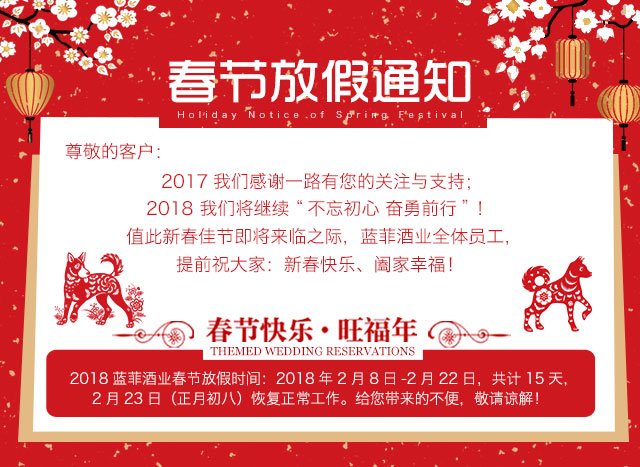 新年的鐘聲即將敲響,根據國家春節假期通知及藍菲公司的實際情況,確定于2018年2月9日-2月22日,共14天,為藍菲酒業春節假期,于2018年2月23日(正月初八)正式上班,請好朋友們悉知。同時在此提前恭祝,新春快樂!