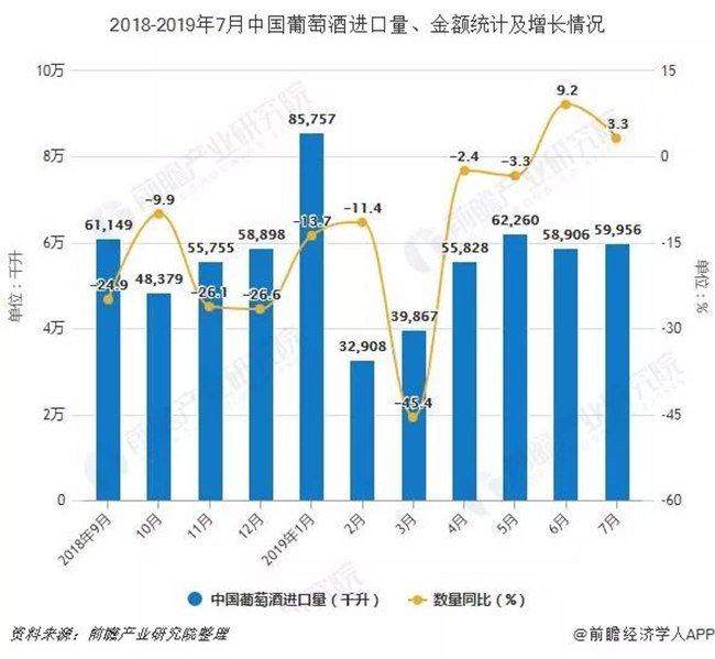 據中國海關總署數據顯示,2019年1-2季度中國葡萄酒進口量有所增長,2019年7月中國葡萄酒進口量為59956千升,同比增長3.3%。累計方面,2019年1-7月中國葡萄酒進口量達到395429千升,同比下降10.8%。